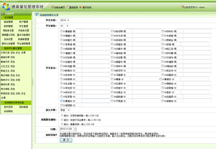 本软件的2.0版本荣获2013年广东省教育多媒体软件大赛一等奖! 4.0版本是2017年广东省教育信息技术专项课题结题成果之一! 本软件由学校德育一线的管理者指导开发,是国内最先研发德育专用软件的,也是目前国内最专业最成熟的德育管理软件。深知学校德育工作的繁琐,本软件就是将繁琐的工作解脱出来,更方便的服务于学校管理。本软件已经在全国一百多所学校使用,可根据学校需求定制功能。 现在开发出来的是5.0版本。 本系统可以根据学校德育量化考核规定,自行调整修改考核条目和分值,后台录入考核记录后,前台可以统计班级和学生,每周,每月,每学期的成绩。后台录入具备:多生,多班,多课等多种录入模式,提高录入数据的效率,也具备学生请假功能。在后台添加各项违纪和表彰记录,前台自动统计分值,避免Excel公式繁杂和人工操作出错,也可以随时查询各班违纪情况,班主任可及时跟进管理,还有留言反馈功能,班主任对分值由疑义,可在线询问。 5.0功能大致有:项目自定义,分数自定义,基本实现自动录入情况,避免手工录输入;学生批量上传;分班上传;手机录入数据,方便快捷;录入数据时显示学生照片,避免学生报假名;前台按天、周、月统计班级德育量化分数及排名;可查询学生所有记录情况和德育分数;方便学校班级德育量化管理,可适用各中小学校,职业学校等。 其他演示版本:请点击:小学版 中学版 中职学校版 完全中学版 账户:学校,admin,密码, 试用请联系QQ:27134474,微信手机同号:13433282575 通用版试用地址:http://www.neteaching.net/ 最新增功能: 1.学生宿舍体现,可以具体到宿舍楼、宿舍号、床位号。 2.成绩管理,可以导入学生的考试成绩,排名,进退。(本功能暂对中小学开放,职业学校、大专院校待开发。) 3.老师的跨级任课。小学、职业学校都存在一个老师跨年级上课的情况,现已新增此功能。 4.学生日常成长记录评价(不计入分数) 5.优化手机页面,能拍照上传图片。手机版需要在文本区域点击一下,获得焦点后,再点击提交按钮,才能提交内容。 其他演示版本:请点击:小学版 中学版 中职学校版 完全中学版